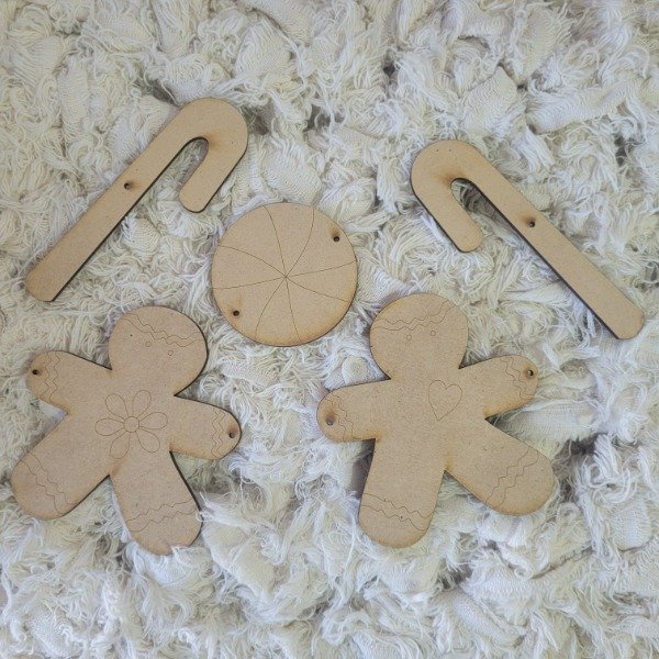 Kit de 5 piezas para decorar. Incluye 2 Cookies, 1 caramelo y 2 bastones navideños ideal para decorar en cuello de botellas, frascos, cajas o para utilizar como aplique o colgante simple ya que se le puede pasar una cinta, cordón o retazo de tela para poder atar.